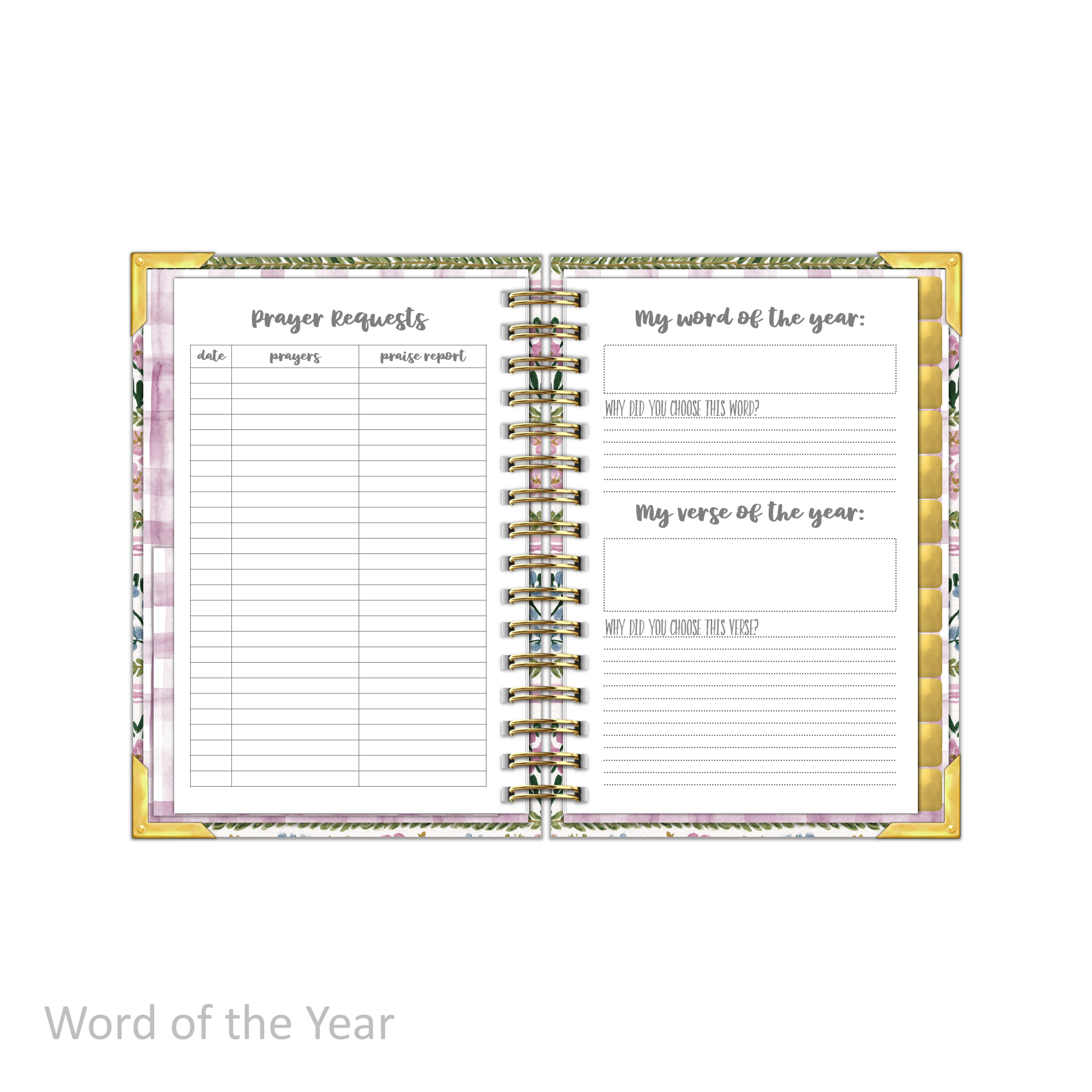 • 12 Thick Monthly Tabbed Pages - Gold foil with BOLD white lettering
